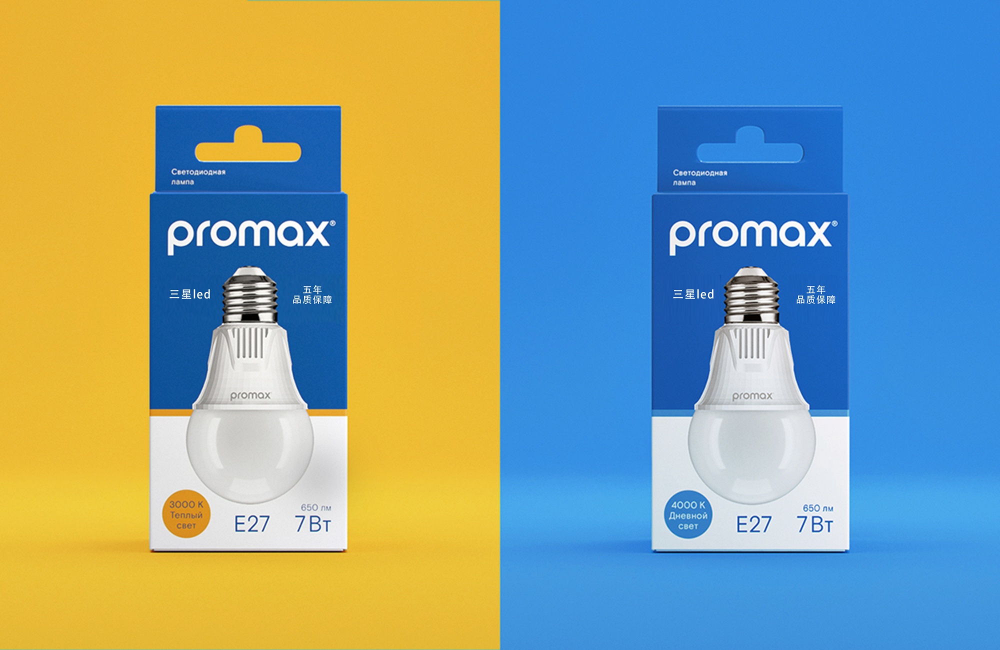 包裝上白色和藍(lán)色的組合說明了照明和非照明空間之間的邊界。它通過散熱器和燈泡之間。線的顏色和正面的小圓圈表示溫度為輕冷或暖。