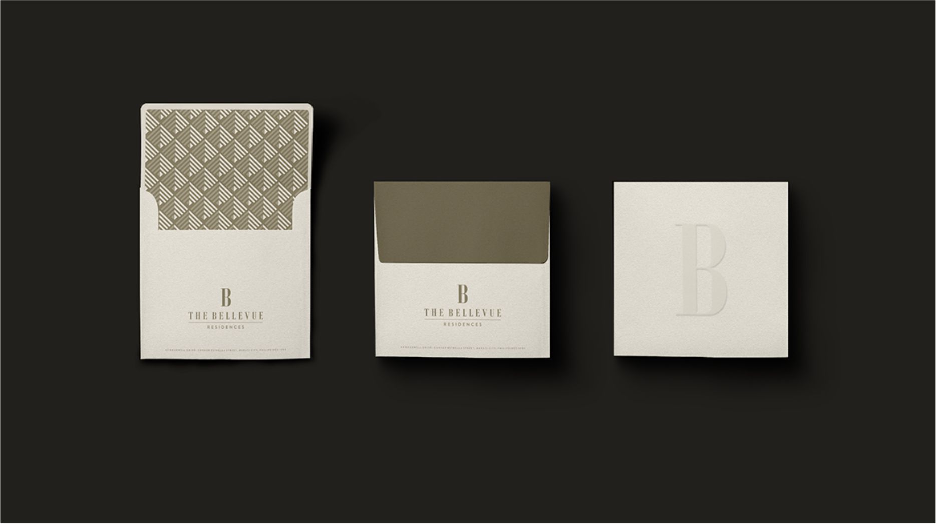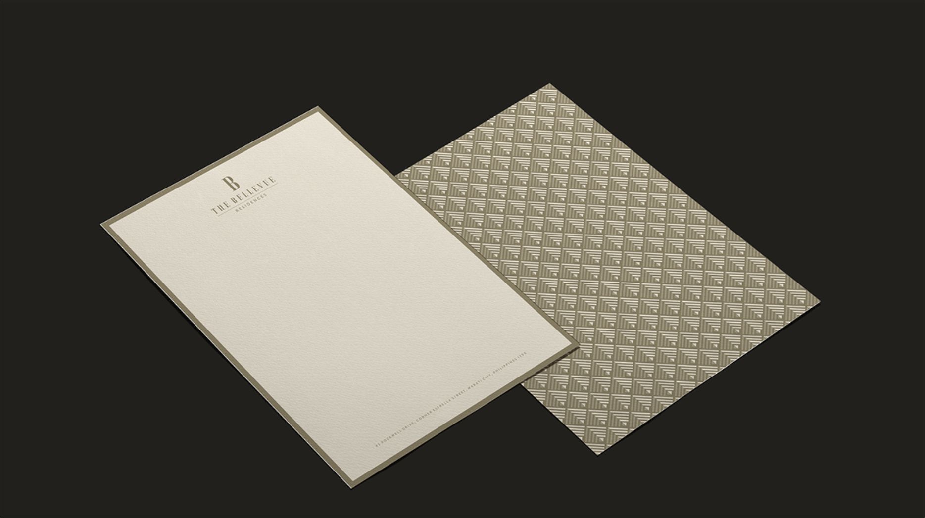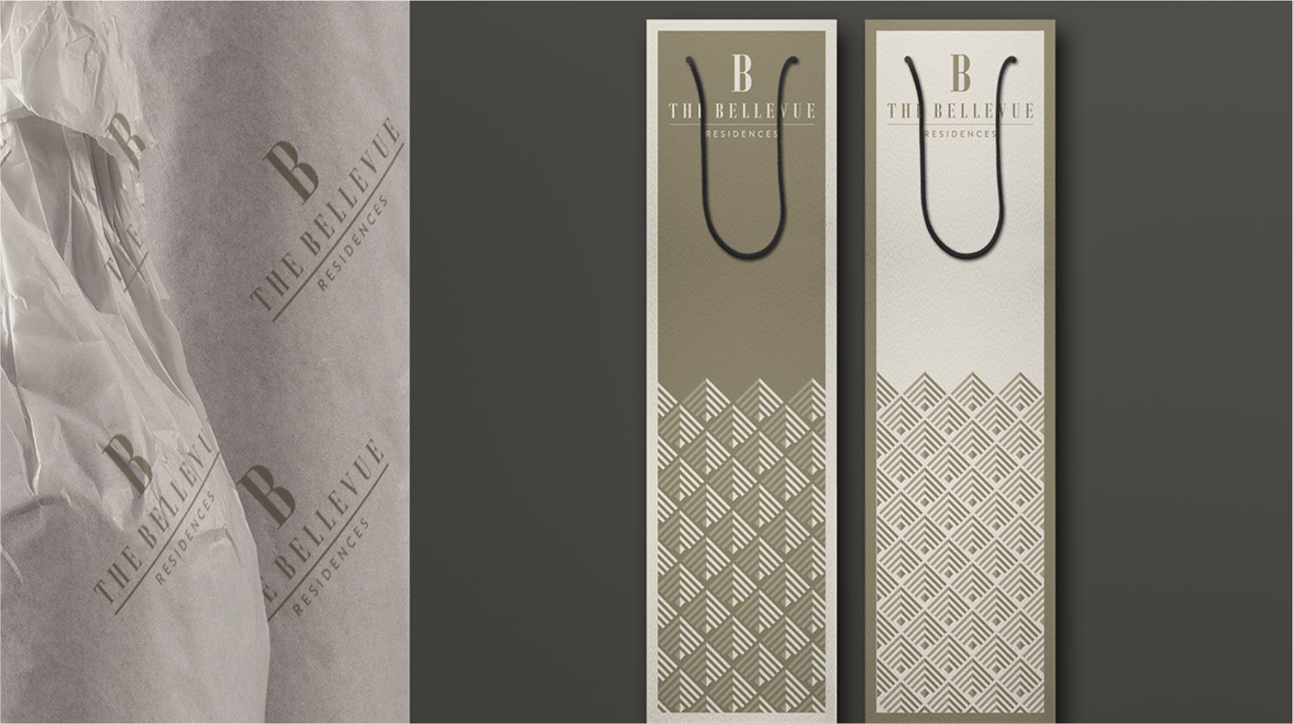 LOGO:這是一個簡潔而有力的設(shè)計,使用了一個襯線字體的大寫字母“B”,下面寫著“THE BELLEVUE”和“RESIDENCES”。LOGO的顏色采取暗金色,與酒店的整體風(fēng)格相呼應(yīng),也象征著貴族和尊貴的氛圍。LOGO的整體形狀,給人一種穩(wěn)定和平衡的印象,也適合在各種媒介上使用。