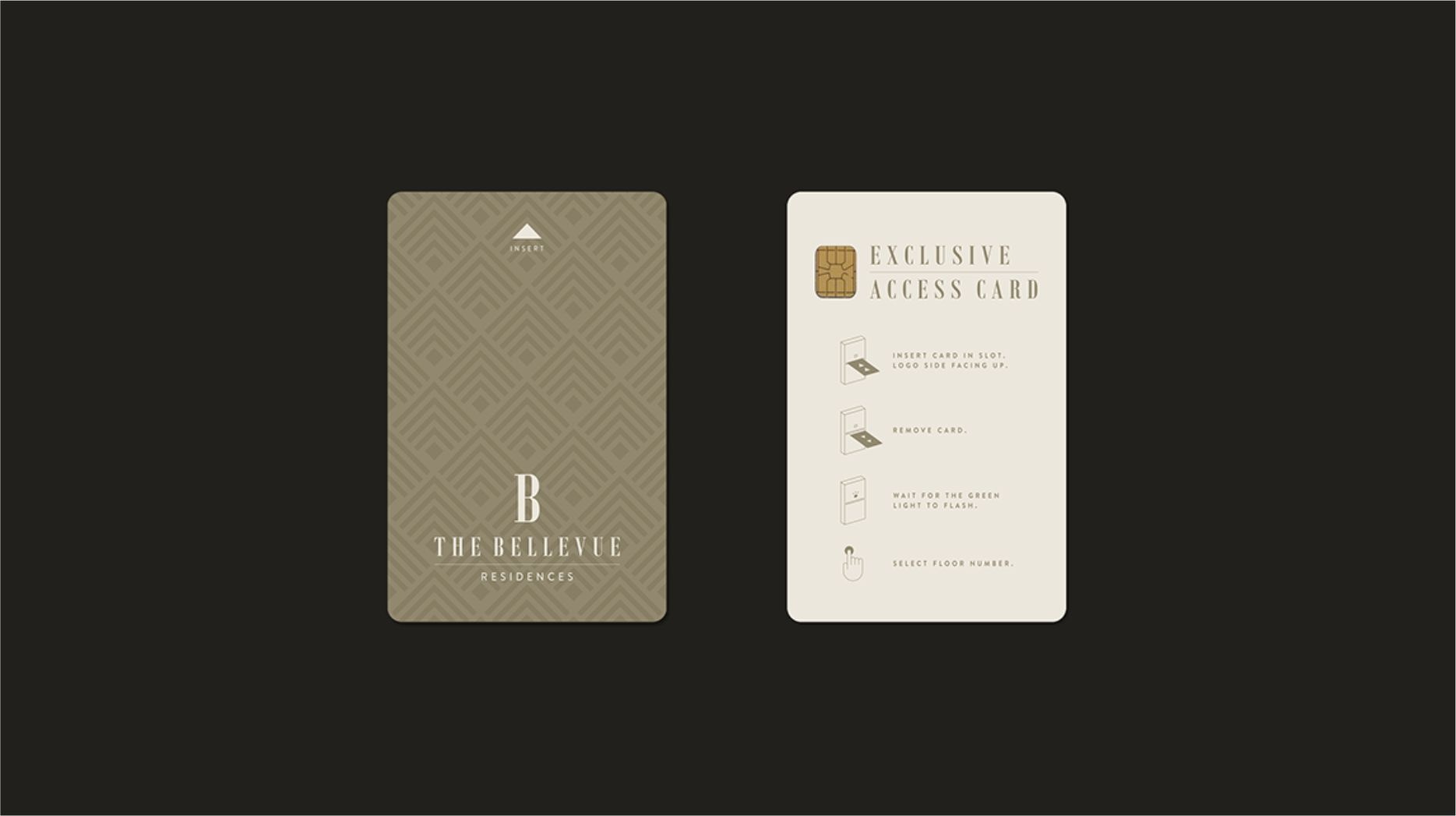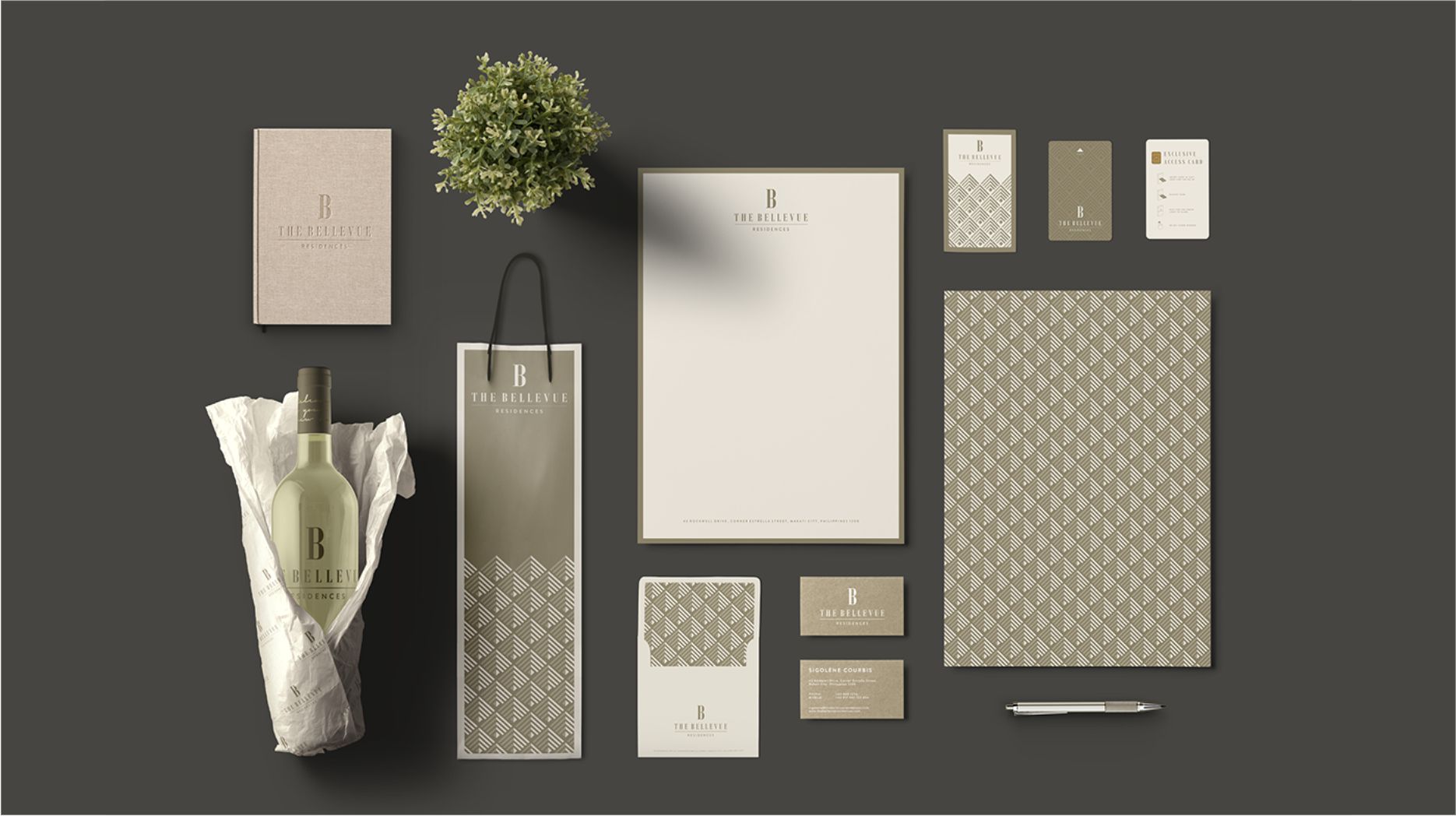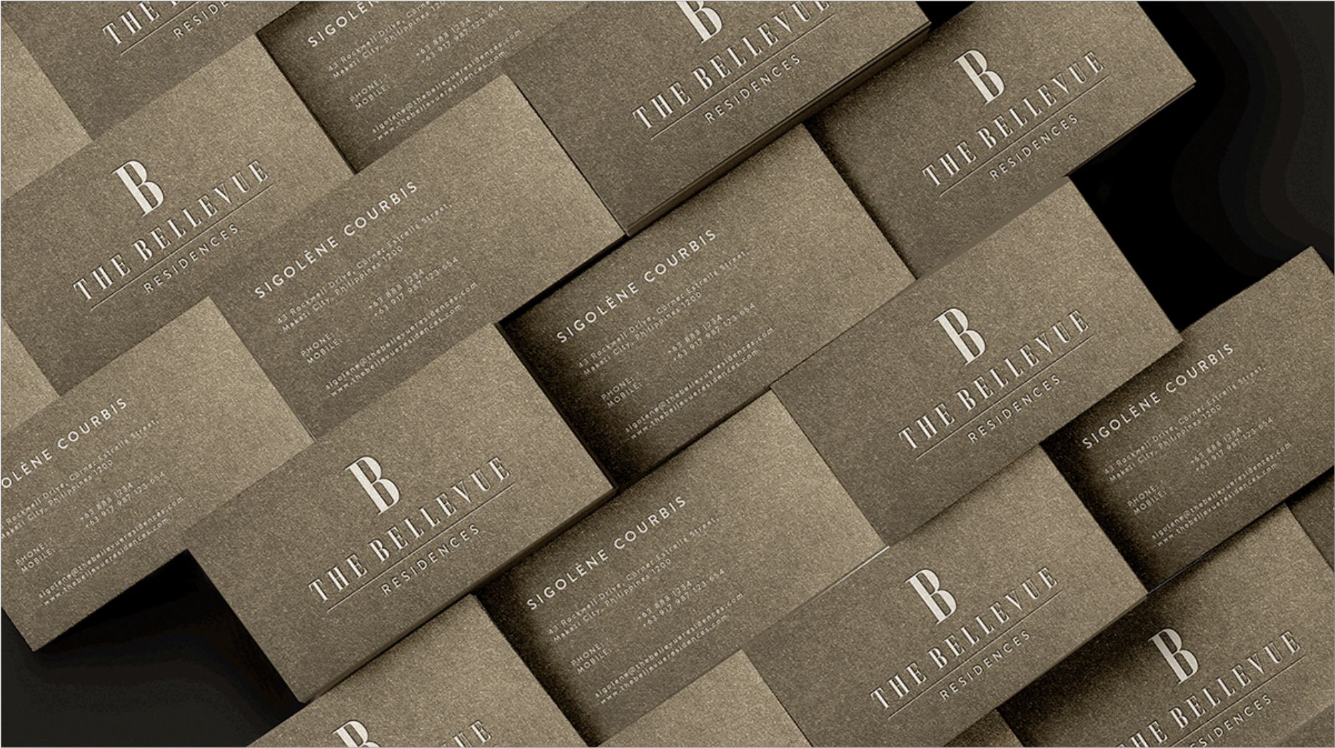LOGO:這是一個簡潔而有力的設(shè)計,使用了一個襯線字體的大寫字母“B”,下面寫著“THE BELLEVUE”和“RESIDENCES”。LOGO的顏色采取暗金色,與酒店的整體風(fēng)格相呼應(yīng),也象征著貴族和尊貴的氛圍。LOGO的整體形狀,給人一種穩(wěn)定和平衡的印象,也適合在各種媒介上使用。